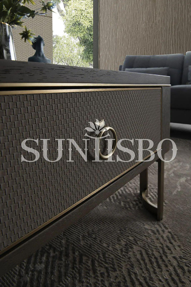 面板鑲嵌的編織紋皮質(zhì)在實(shí)木的基礎(chǔ)上進(jìn)行雕刻,輔以極佳的傳統(tǒng)編織藝術(shù),讓空間倍顯溫潤(rùn)時(shí)尚感。