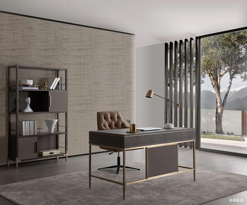 沉靜雅致的書房空間,溫潤實木與硬朗金屬線條相互配合,運用基礎幾何,打造空間的高級感。輕奢質感緩緩流淌,書籍整齊,擺件精致,無一不追求著精致細節與極致的品味,營造出時尚與沉穩并列的氛圍,詮釋著居者對是生活環境的內在追求。
