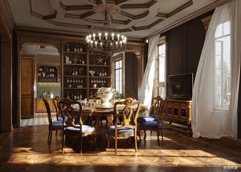 書(shū)房護(hù)墻板是由白楓木皮拼接的花鬘圖案,顏色層次分明,立體感超強(qiáng),營(yíng)造了滿滿的美式鑲嵌藝術(shù)感。深沉木色邊柜在護(hù)墻板上延伸,逐漸浸染了古銅色的家具和燈飾,結(jié)合著拱形羅馬柱,塑造出端雅大方的環(huán)境氛圍。