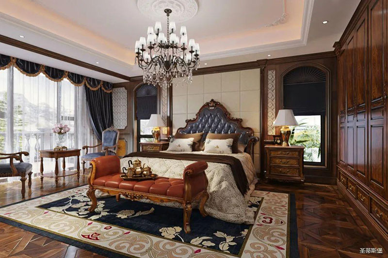 主臥置頂復(fù)古紋理的實(shí)木衣柜,在完善了收納的同時(shí),極簡(jiǎn)動(dòng)線也完整了生活的風(fēng)貌。深海藍(lán)的高床屏與米色背景碰撞,猶如海水與沙灘相融,置身其中,仿佛與藍(lán)天碧海來(lái)了場(chǎng)浪漫自然的邂逅。地毯上精致的古典鮮花紋理,擷取設(shè)計(jì)師的絕妙巧思,與空間的雕花藝術(shù)相呼應(yīng),在居家空間里演繹了一場(chǎng)溫馨的藝術(shù)創(chuàng)作。
