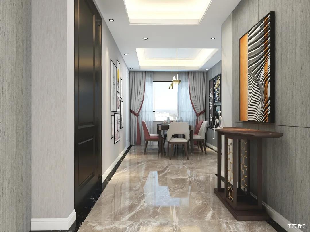 客廳與餐廳雖分兩個空間展開,但無明顯隔斷,室內一眼望去,清透明亮,就近靠窗可引入秀麗美景,迎來充沛的陽光。造型燈線條也頗有意境,讓空間圓潤生動起來,整體顯得大氣雅致,輕奢有范。軟裝搭配的選擇也極為重要哦,好的搭配才能彰顯品位,色彩跳躍的裝飾畫,讓整個空間鮮活生動,飽滿有趣。