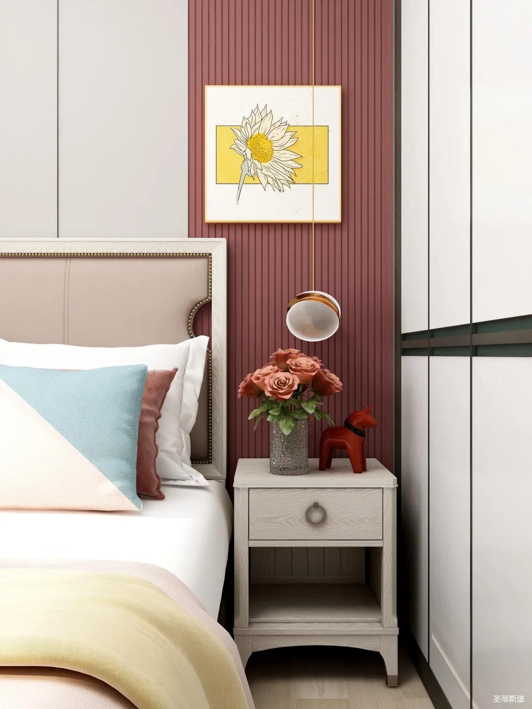 兒童空間雖不及其他空間寬敞,但細節設計更為貼心,淡粉的床屏與酒紅木飾面形成深淺色的對比,色彩跳躍,洋溢著兒童應有的青春活力。床前的閱讀燈,讓空間設計感up的同時,也便利了兒童的閱讀學習。