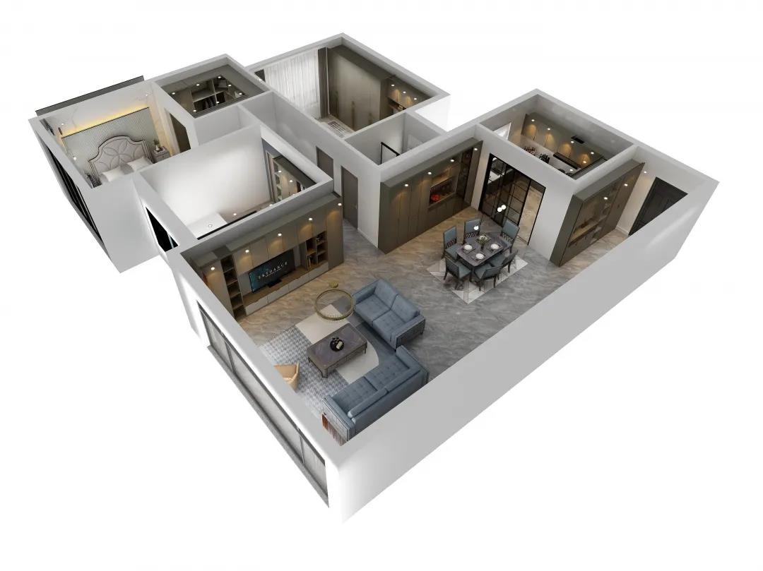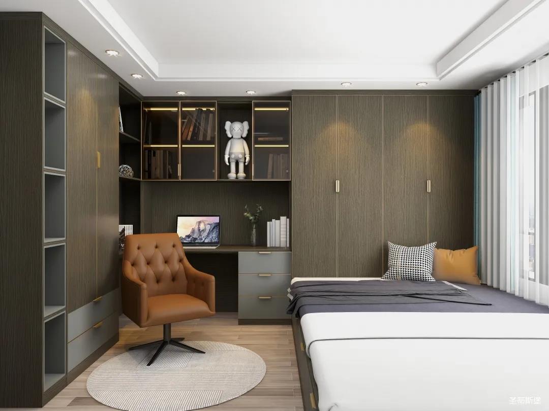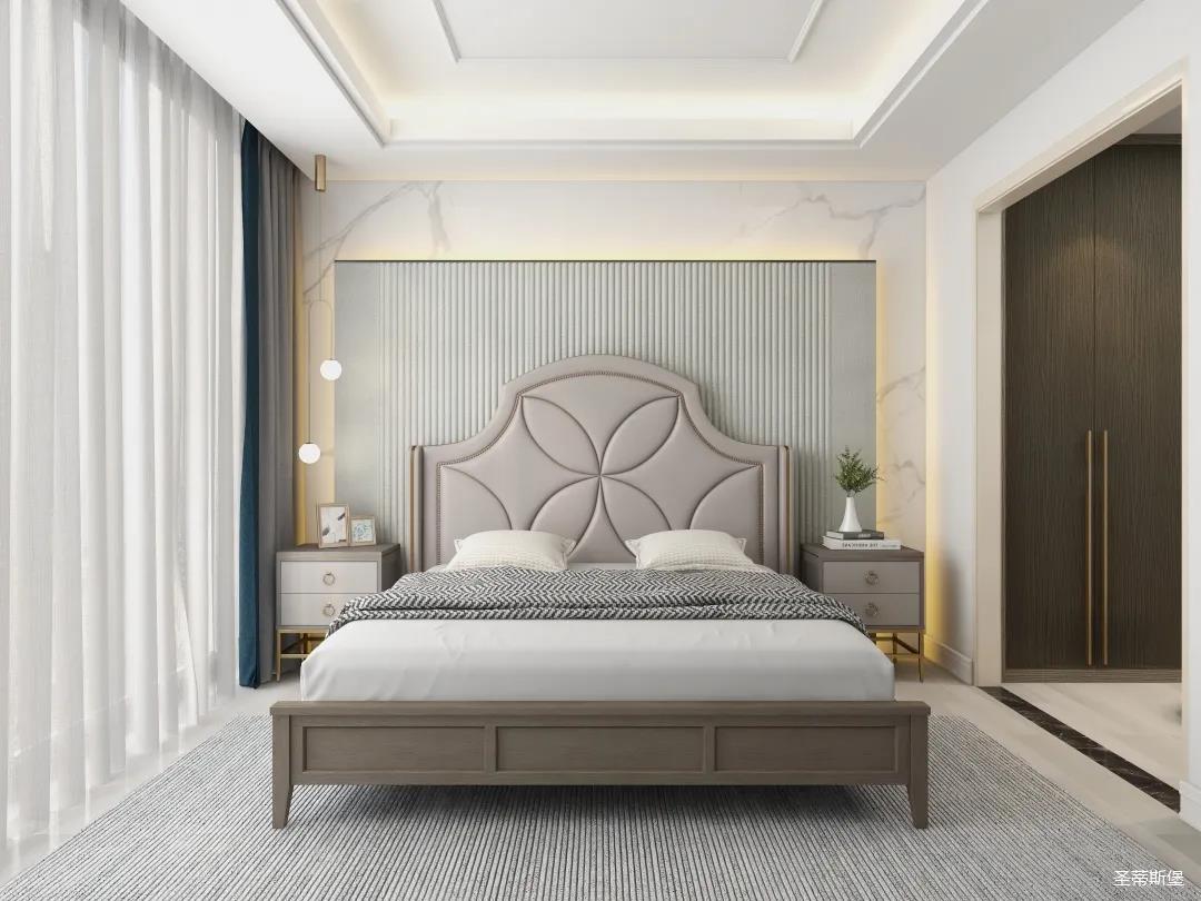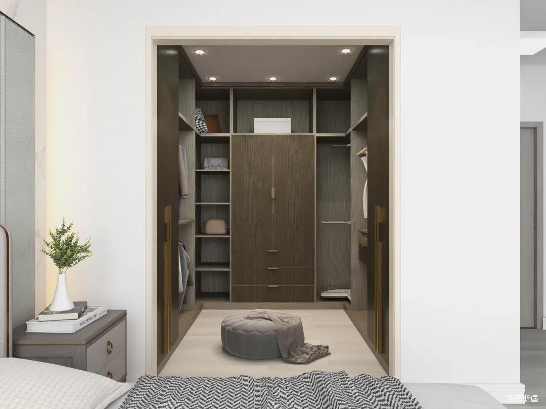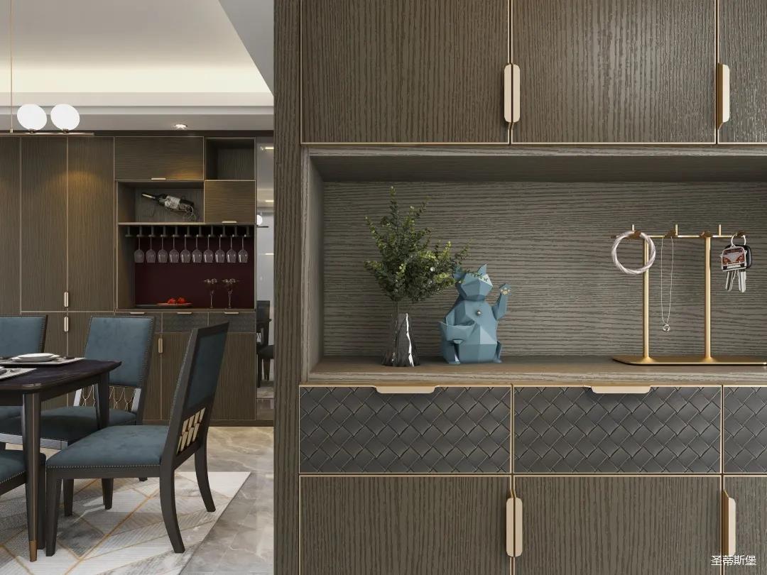 材質的交替與光影的變換,具有濃濃的現代簡奢色彩 。 獨一無二的英倫爵士灰定制柜,由延邊鑲嵌的香檳金拉絲金屬分割,線條流暢且奢華,不僅代表著時尚,也崇尚了實木韻味。設計師將現代、實用、精致的藝術設計風格應用其中,更是精致生活方式的藝術演繹。在平靜的空間中表現出獨特的藝術骨感,滿足我們對精致生活的精神追求。