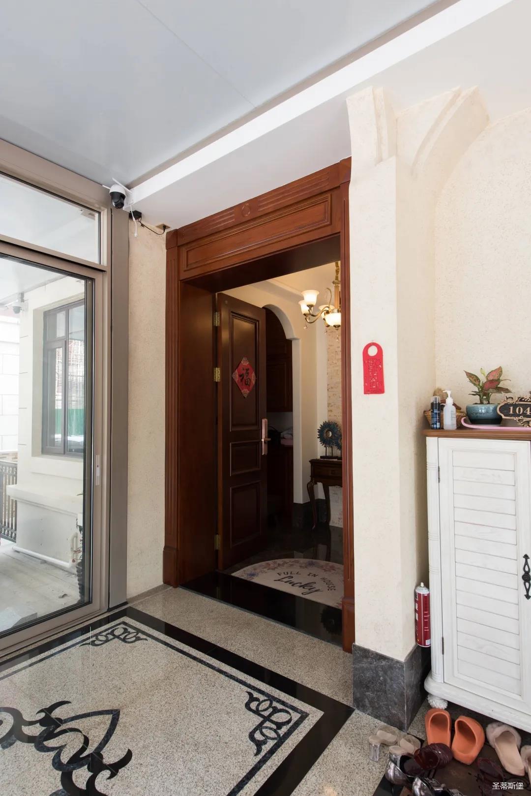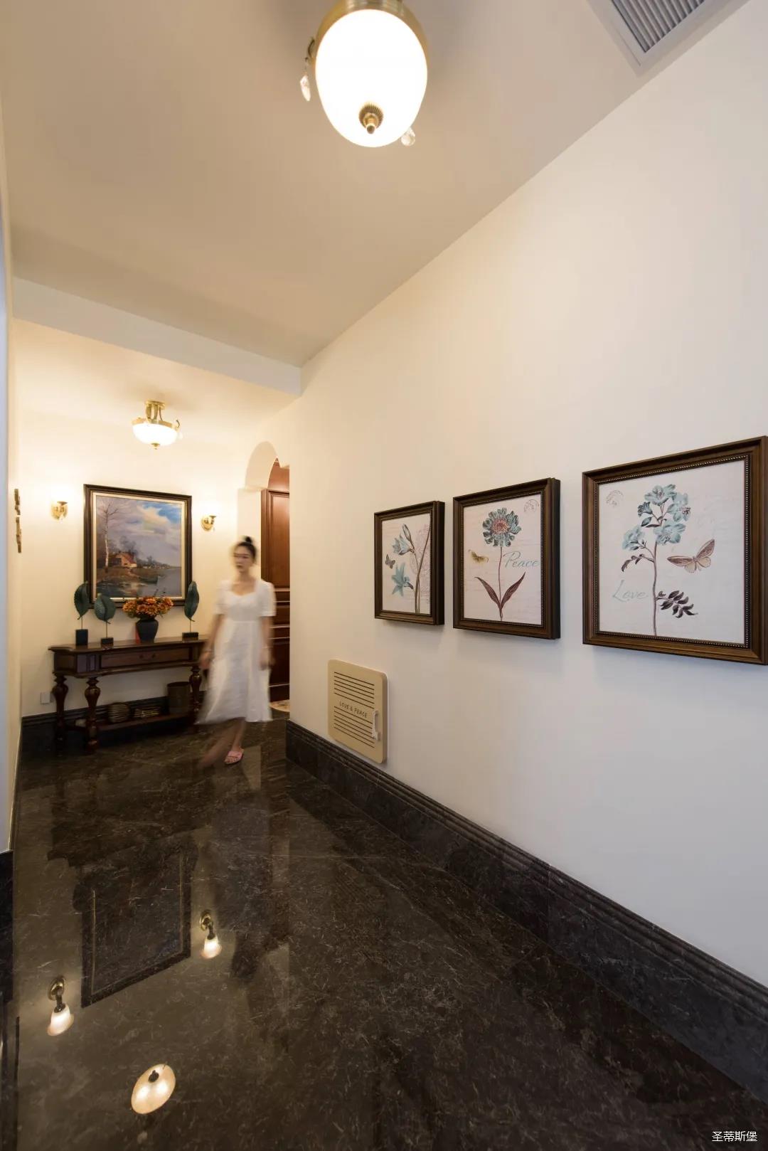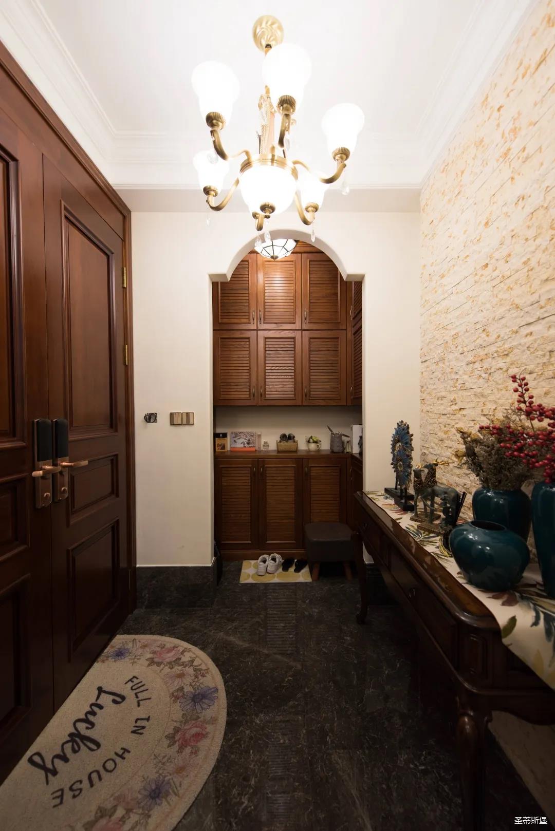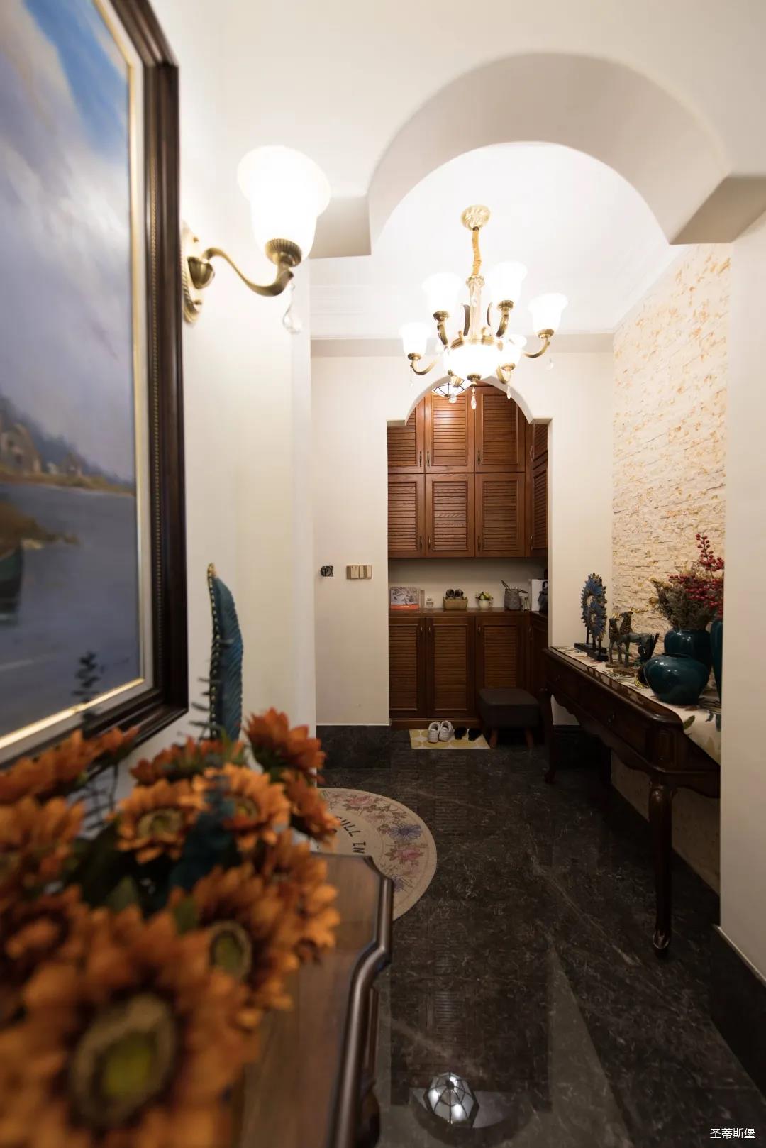 入戶玄關雙開門設計,儀式感滿滿!地面定制的瓷磚貼花設計,典雅又大方。核桃實木玄關桌,加上精致的擺件,經典美式復古吊燈,不著痕跡的展現出居者對生活的激情,魅力吸睛,從入戶開始感受古典氛圍。