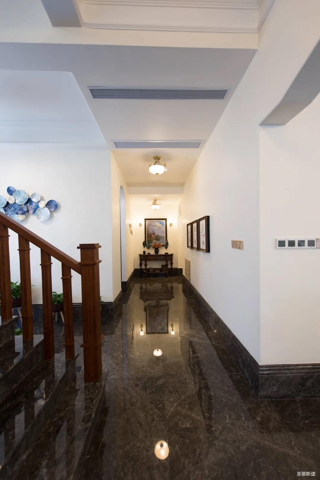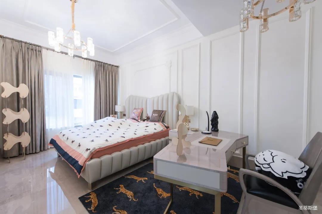 經過房間玄關過道,一眼就被這夢幻的景象給征服,摒棄繁雜,少許的金色元素點綴,予以空間輕奢細膩的質感,卻又不失美式韻味。