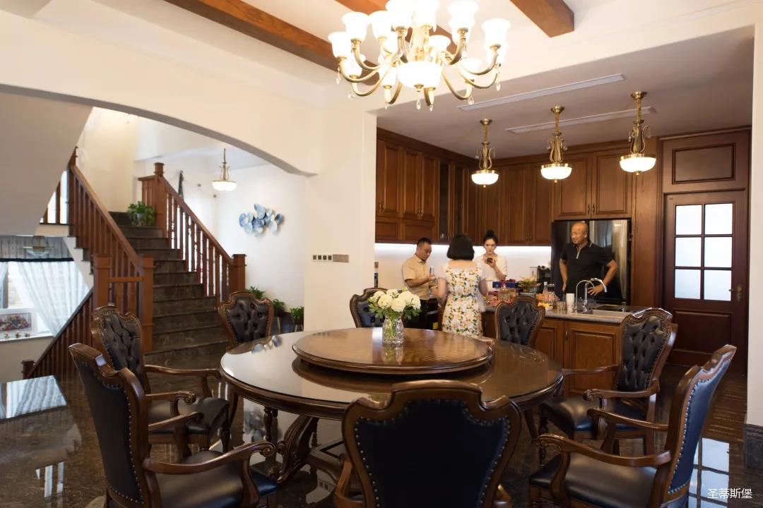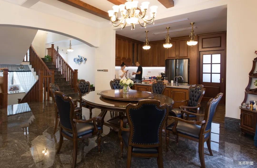 玄關進入轉角處,以穩(wěn)重大氣實木為主色調的開放式中西餐廚空間,將一體化無隔斷設計貫徹到每個細節(jié),采用了親膚真皮質感的餐椅,手工雕刻的曲線讓原本硬朗的空間變得格外優(yōu)雅,自上而下,構成完整的美式空間氣度,在每天的生活點滴間,沉浸在美式風情中,更加隨性舒適。