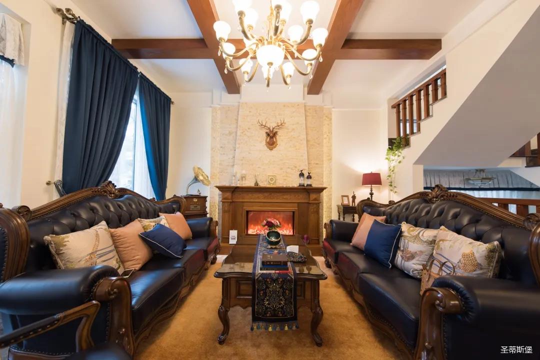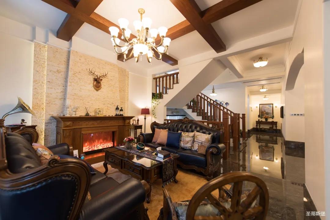 歐美實木吊頂設計,與沙發(fā)茶幾上下呼應,相得益彰,提升了空間層次感。