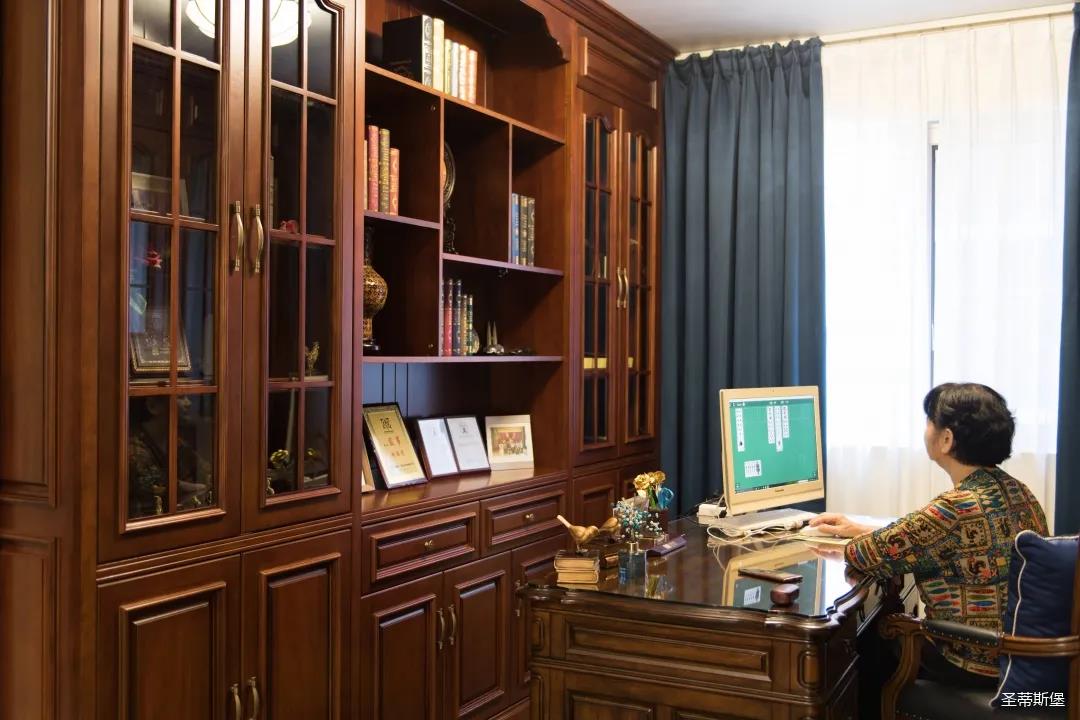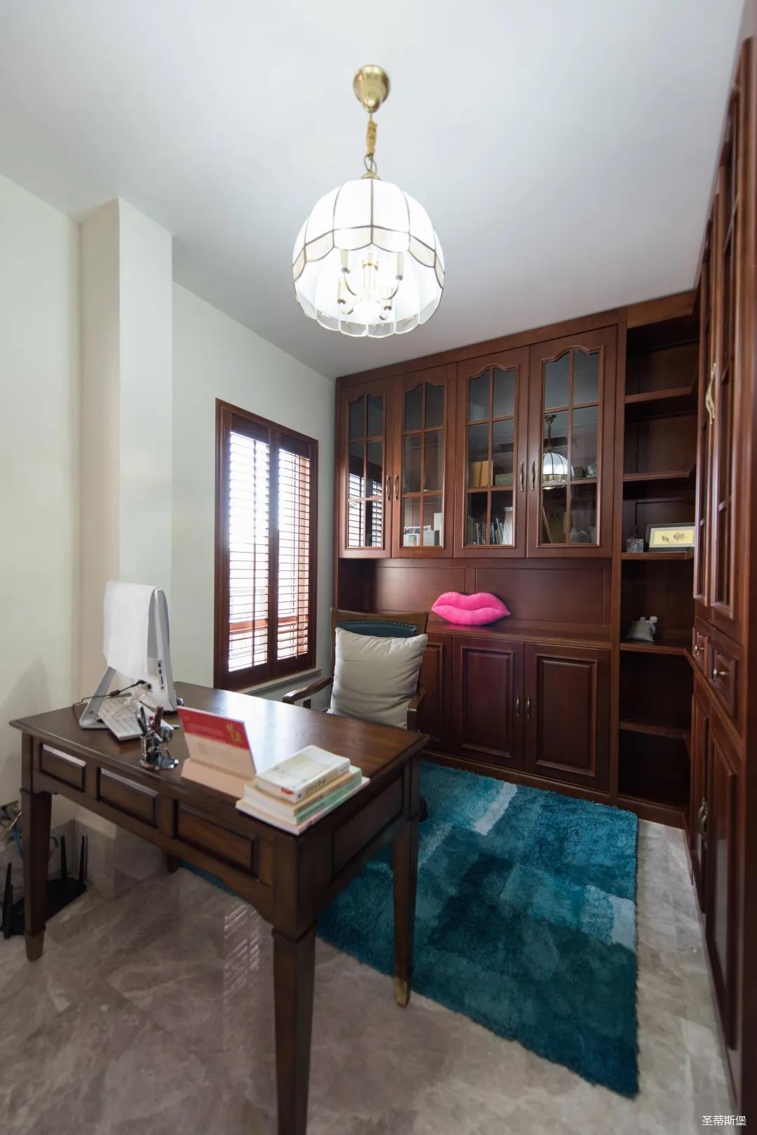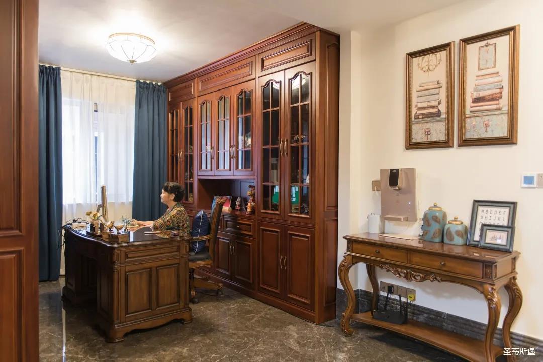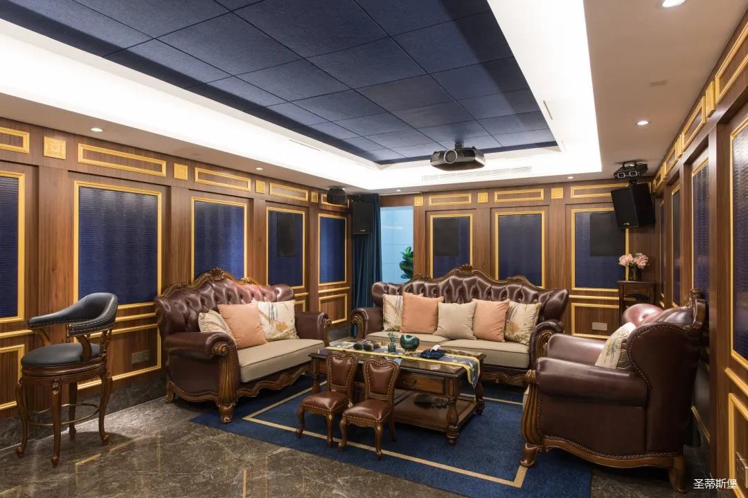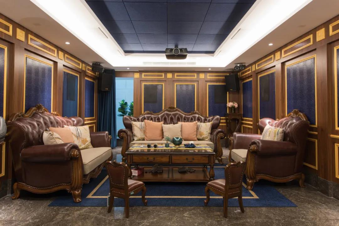 業(yè)主夫婦非常熱情好客,平時工作之余也會在家里邀三兩好友一起觀影,觀影室的整體設計容納著濃烈的古色古香,長方形圖案排列搭配復古的家具與配飾,精細的雕花藝術,于細節(jié)之間演繹著精致生活。不管時光如何輾轉變換,家的定義從不曾改變,它撫慰著我們的心靈,承載著我們的喜樂,從細膩的質感中感知家的點滴變化,才是對生活最真實的寫照。