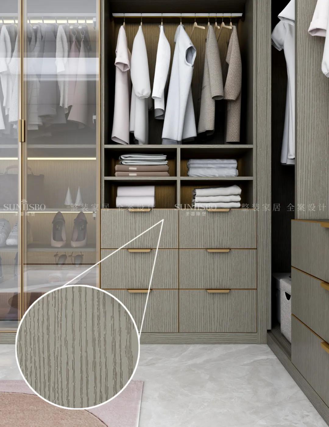 當(dāng)下人對(duì)原生態(tài)材質(zhì)的極致追求也是當(dāng)下人回歸自然的一個(gè)方式,現(xiàn)在很多高端的精裝房墻上都是木飾面,這些木飾面都是貼木皮或者帶木紋的產(chǎn)品,洛斯系列采用紅橡直紋的實(shí)木壓紋工藝,使木紋呈現(xiàn)河流的波紋狀,第一可以保持很好的原木的質(zhì)感的同時(shí),也能夠給空間帶來一種靈動(dòng)感,不會(huì)顯得呆板與單調(diào)。由于木面的半開放式涂裝,表面凹凸不平,深淺有致的設(shè)計(jì),使產(chǎn)品在燈光下產(chǎn)生漫反射的光線折射,降低了整體產(chǎn)品和空間上的高光感,使人在心理上有更加柔和感受,更加有生活的氣息,就像亞麻質(zhì)感的面料會(huì)讓更多的人接受;與市面上大部分輕奢的鋼琴烤漆相比,鋼琴烤漆的表面是平整光滑的,因此在光線下呈鏡面反射,雖然看起來會(huì)有奢華的效果,但是如果放在家里則會(huì)給人帶來冰冷與距離感。