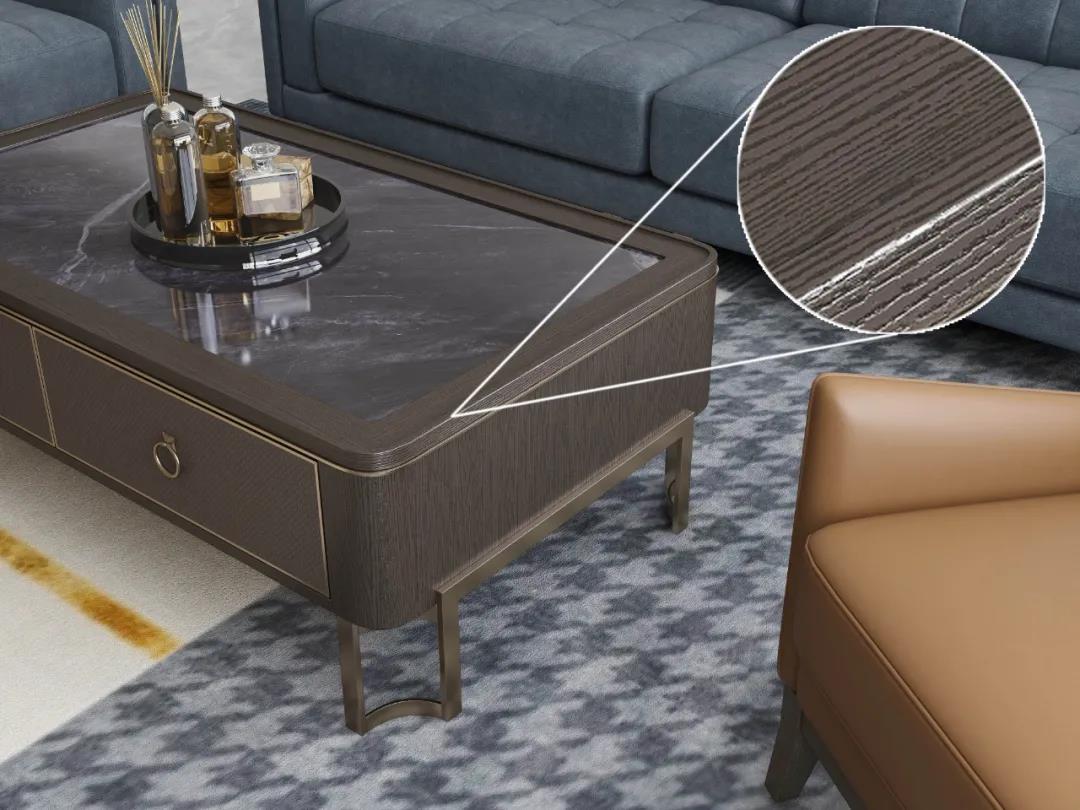 洛斯系列在現(xiàn)代時(shí)尚的基礎(chǔ)上還增加了許多輕奢的金屬元素,金屬元素在輕奢風(fēng)里毋庸置疑的存在。為什么人喜歡戴耳環(huán)、戒指、項(xiàng)鏈等首飾?為什么衣服、鞋子、包包上都能看到金屬元素的身影?從時(shí)尚圈到家居界,金屬元素憑借其獨(dú)特的質(zhì)感以及由內(nèi)散發(fā)的高級(jí)氣質(zhì),有著強(qiáng)大的包容性,提升風(fēng)格格調(diào),增添時(shí)尚氣息。運(yùn)用在家居中可成為整個(gè)空間的亮點(diǎn),成為時(shí)下家居裝修的潮流趨勢(shì),深受大家的喜愛。但是目前市面上采用金屬鑲嵌工藝的多數(shù)是在板木結(jié)合的基礎(chǔ)上,難度相對(duì)簡(jiǎn)單易操作。在洛斯系列里,是在實(shí)木的基礎(chǔ)上進(jìn)行金屬鑲嵌工藝,要求精準(zhǔn)度非常高,誤差不得超過0.5毫米,不然就會(huì)對(duì)不齊。在洛斯系列中,桌子的四角與腿部、柜類門板,沙發(fā)腿部,茶幾支架,餐桌臺(tái)面,床品外框等都將金屬恰到好處地融入到空間的每個(gè)角落,讓空間擁有輕奢的高級(jí)感,提升空間的質(zhì)感。將優(yōu)雅謙遜的都市精致感全面呈現(xiàn),讓裝修冷中帶暖、沉靜精致,也向人們展示了一種精致的生活方式,更為整個(gè)家注入靈動(dòng)氣息。