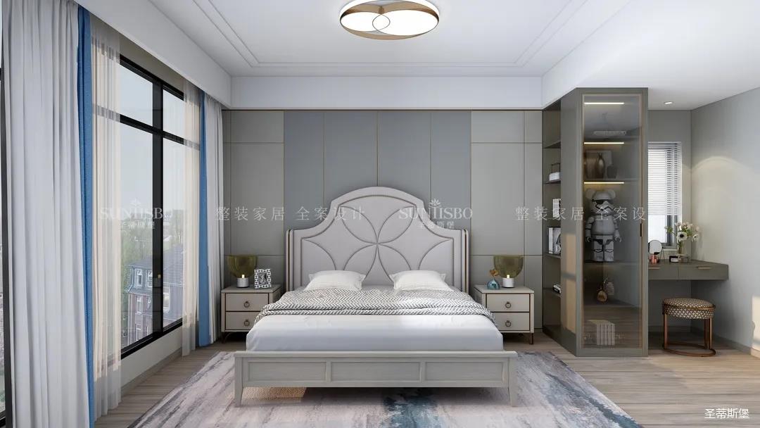 主臥的設計,整體風格與色調的一致,通過空間設計與軟裝細節(jié)的調控,顯得主臥多了一份寧靜與放松。四照花床屏的細節(jié)、材質色彩的把握、隔斷小書桌的設計,無不體現(xiàn)著設計師獨特的品位和全案設計的能力。