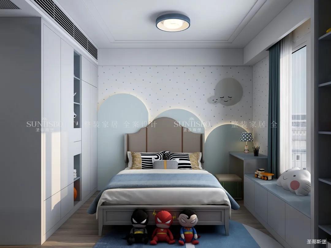 兒童房追求的是童真與自然,柜體的色彩與軟裝搭配完美呼應,云朵山峰的背景墻,以特立獨行的設計在視覺上讓心靈得到放空的意境。沿窗打造的飄窗格局,增加空間的功能性,造型簡約的柜體根據(jù)家裝理念摒棄了繁復的設計,更多展現(xiàn)的是空間自然之美。