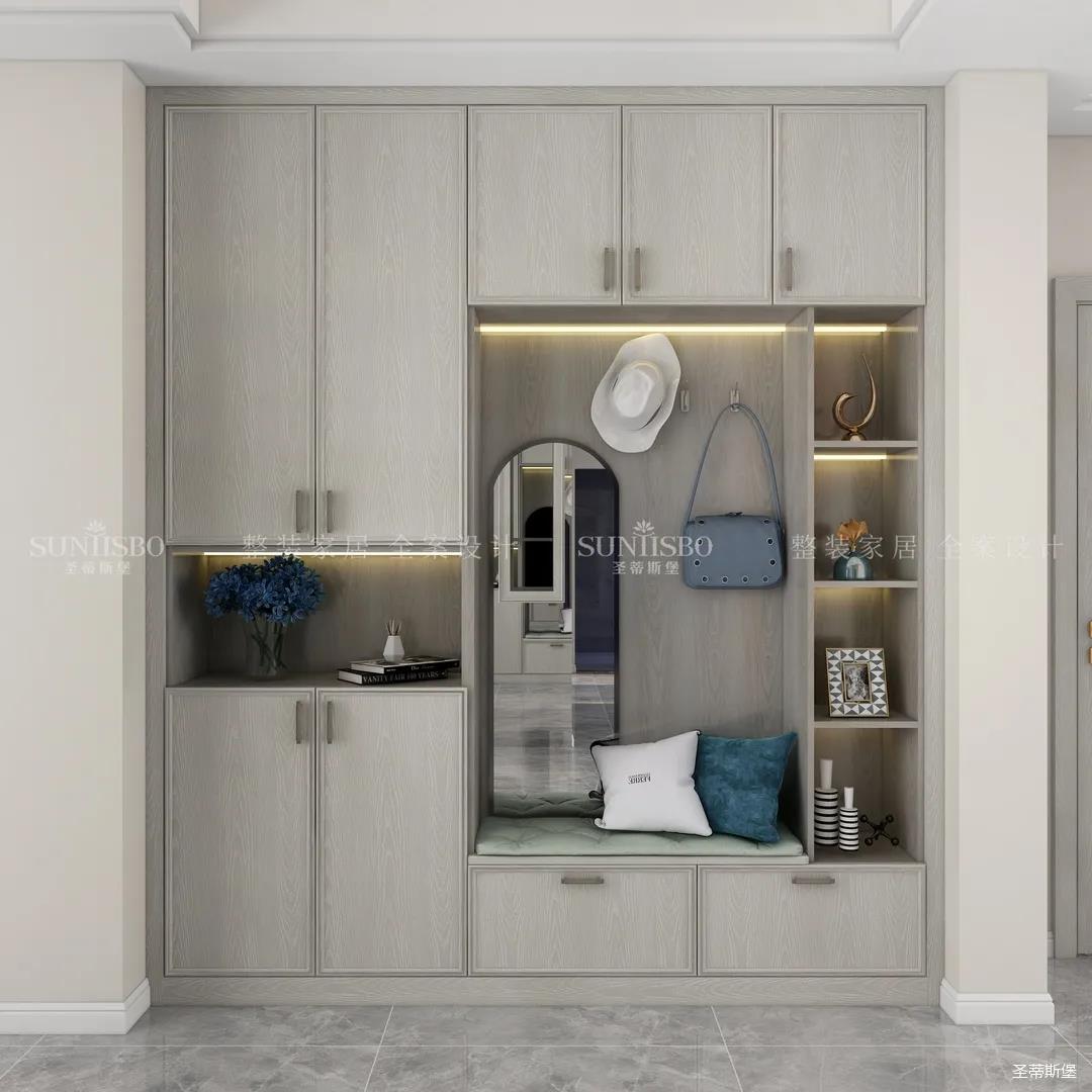 衣帽間是女主特別要求的,設計是將房間打造成衣帽間系統(tǒng),采用L型布局,壁掛式設計,讓穿搭動線更順暢,視覺上也更通透,可直觀的展示女主人穿搭品味。玻璃層板與背板花色的結合,精致靈動,成為時尚與輕奢的寫照,封閉區(qū)衣柜的合理格局規(guī)劃,完美詮釋現(xiàn)代輕奢風于當代定制中的前瞻性。