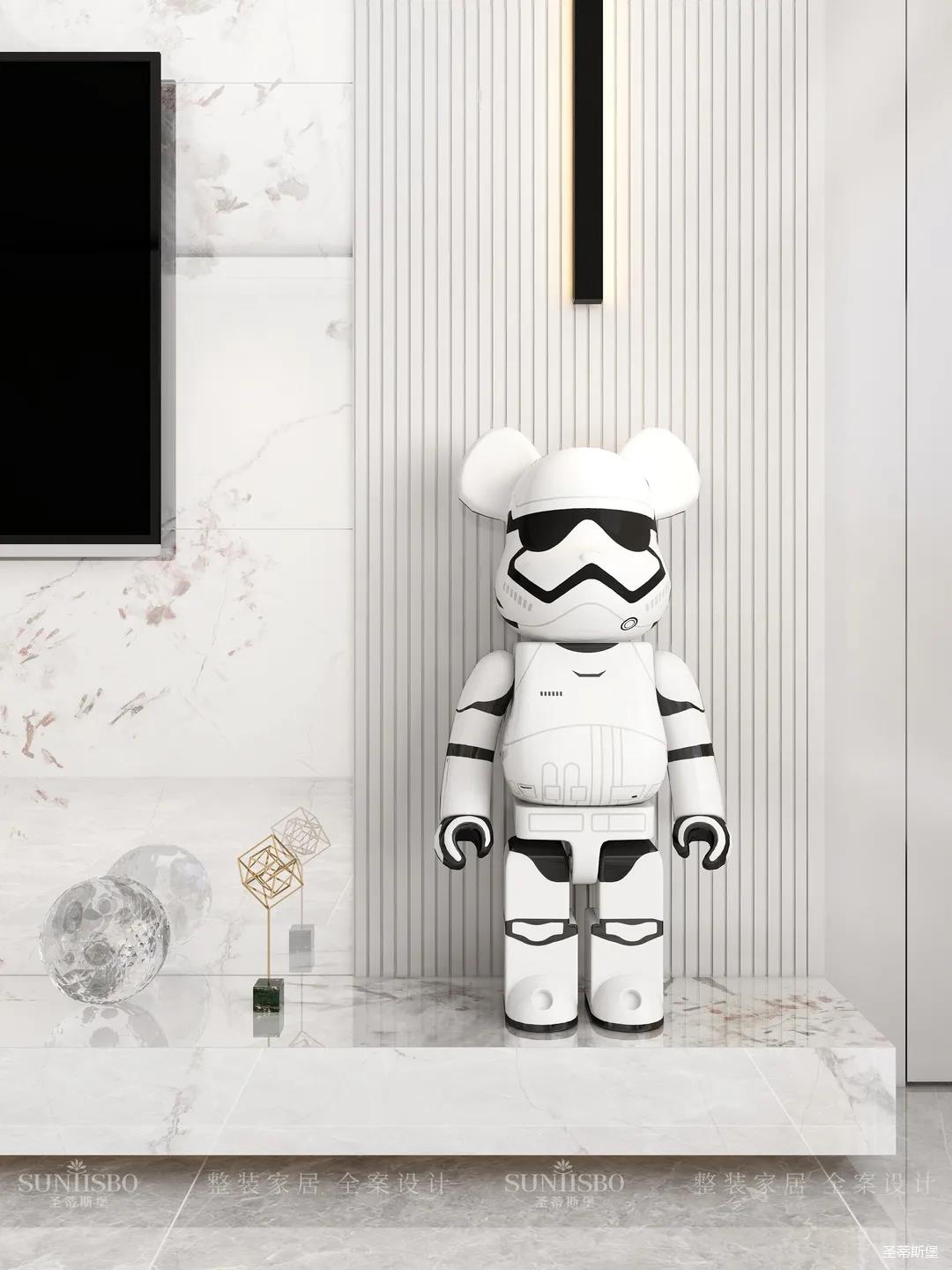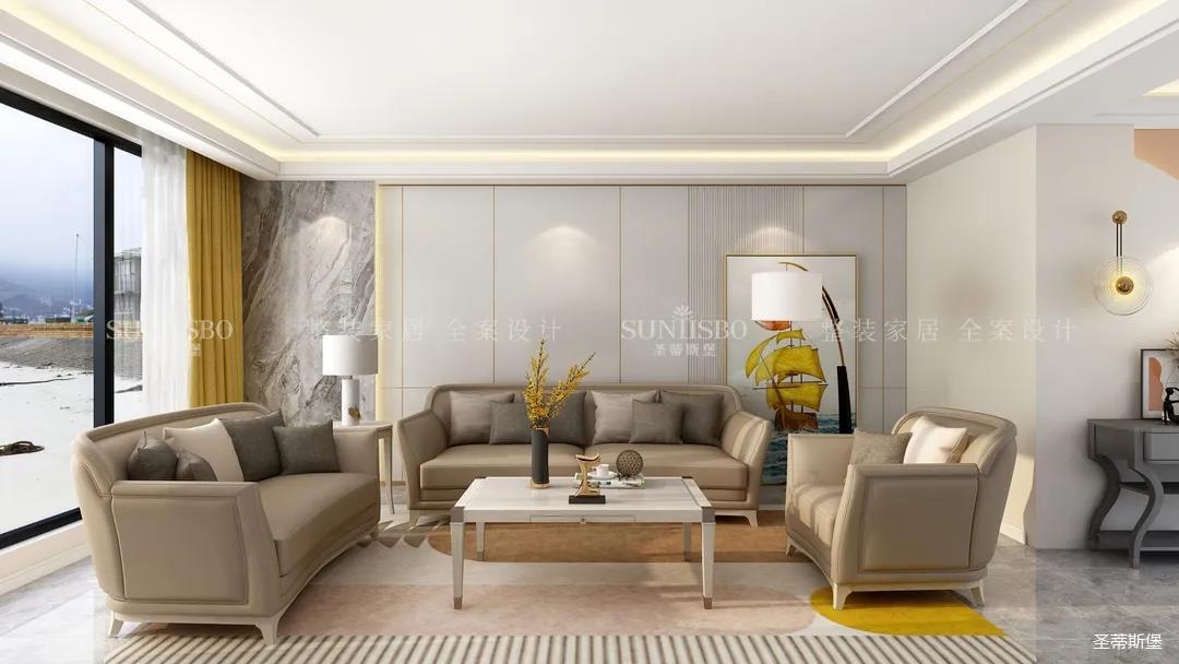 客廳設計置頂展示柜和大理石,實現(xiàn)了現(xiàn)代和輕奢風格間的均衡組合。溫柔莫蘭迪色調的沙發(fā),細節(jié)的實木底座和人性化的環(huán)抱式設計讓空間更添溫馨的氣息。