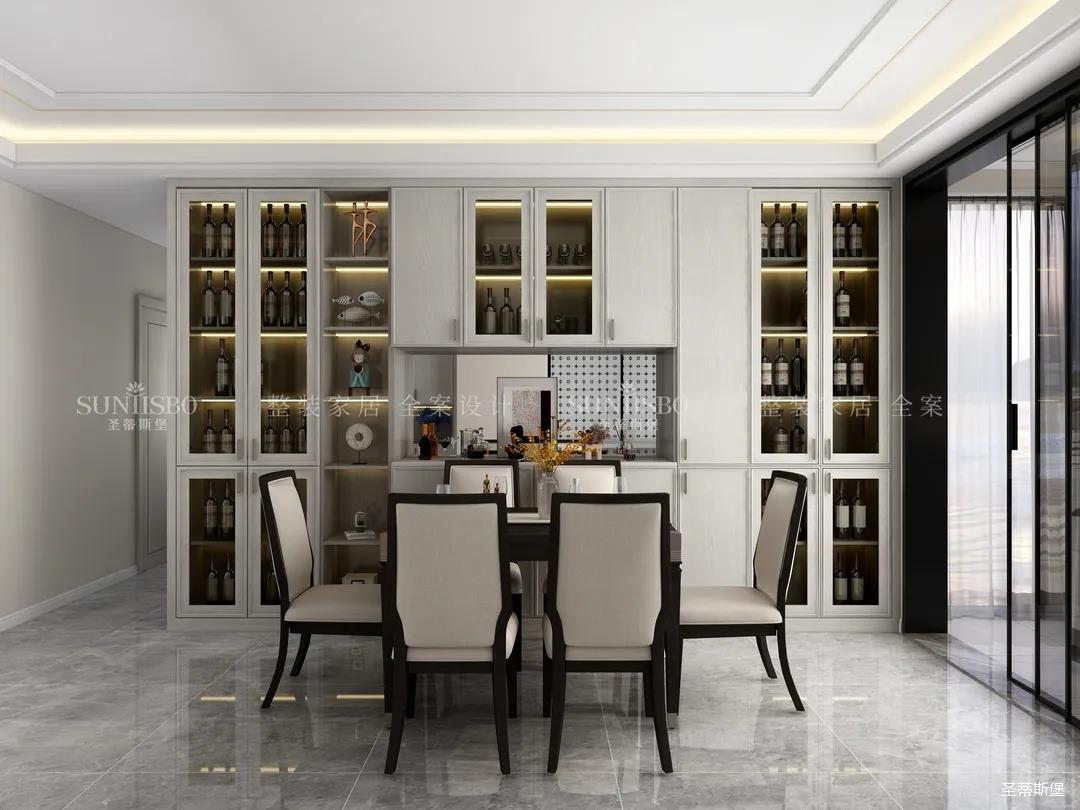 餐廳和客廳以大橫廳的形式展開,設計師將實木、玻璃、皮質、金屬等看似相互排斥的元素相互重組,讓餐廳呈現(xiàn)多元式的輕奢氛圍。深淺色彩,對稱型的定制柜,都讓空間形成強有力的質感對比。無論是午餐窗外的車水馬龍,還是晚宴的點點繁星,都能給屋主帶來良好的就餐體驗。