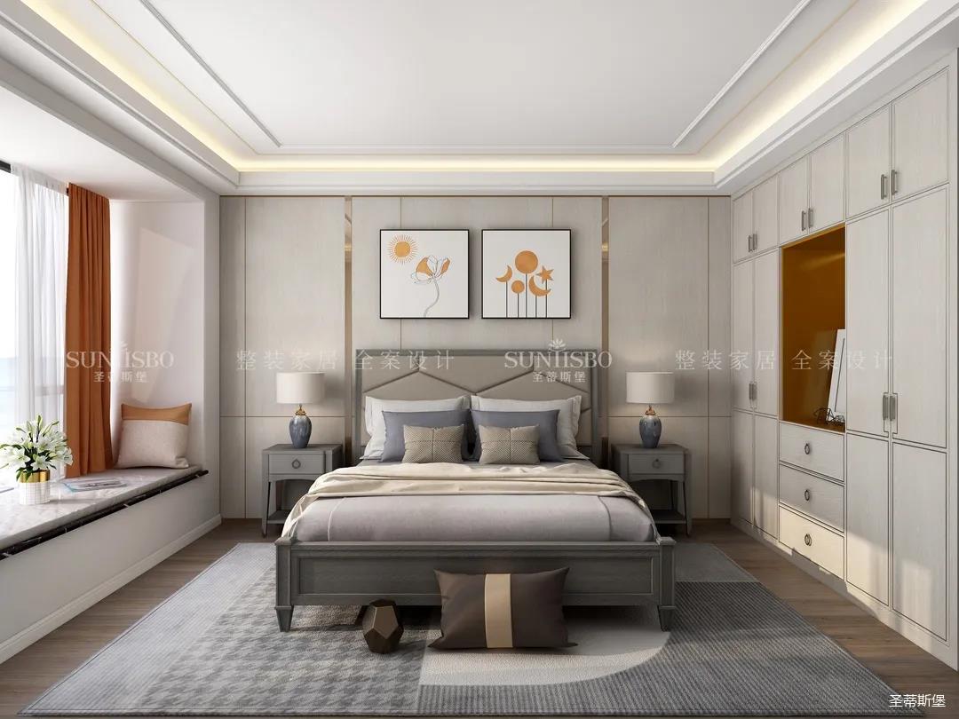 主臥隨著優(yōu)雅的金屬線條鋪開,臥室內的靜謐感有序的傳遞著,帶有溫度的木飾面與溫潤的實木地板在同一空間交匯,充滿輕奢質感。明亮橙的色彩點綴讓空間活躍的格調不斷擴充,仿古白的定制柜體在空間形成若隱若現(xiàn)的視覺平衡,將溫暖,柔和組合成日常的睡眠氛圍。