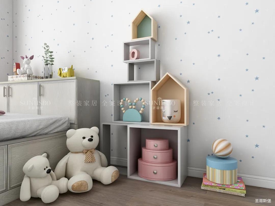 兒童房摒棄了傳統(tǒng)榻榻米的呆板與嚴肅,延續(xù)主臥輕奢雅致的空間氛圍,以木質為主材質,利用面板的線條帶來視覺上的延伸,將童趣與理性相融表現(xiàn)兒童應有的學習氛圍與生活習慣。開放式展示區(qū)應用藍色點綴,再次強化了空間專屬兒童的活躍格調,也呈現(xiàn)了設計師在材質與色彩運用上的精細與專業(yè)。