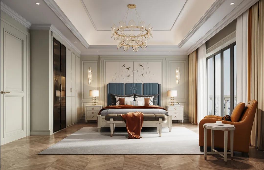 主臥以線條元素做主導(dǎo),軟包的床頭墻面充滿安全感,浮雕的造型給空間布局帶來(lái)了極佳的層次感,以現(xiàn)代美式輕奢框架為主題,融入了美式靈動(dòng)的線條,讓整個(gè)臥室既有時(shí)尚質(zhì)感,又有時(shí)光打磨后的穩(wěn)重。